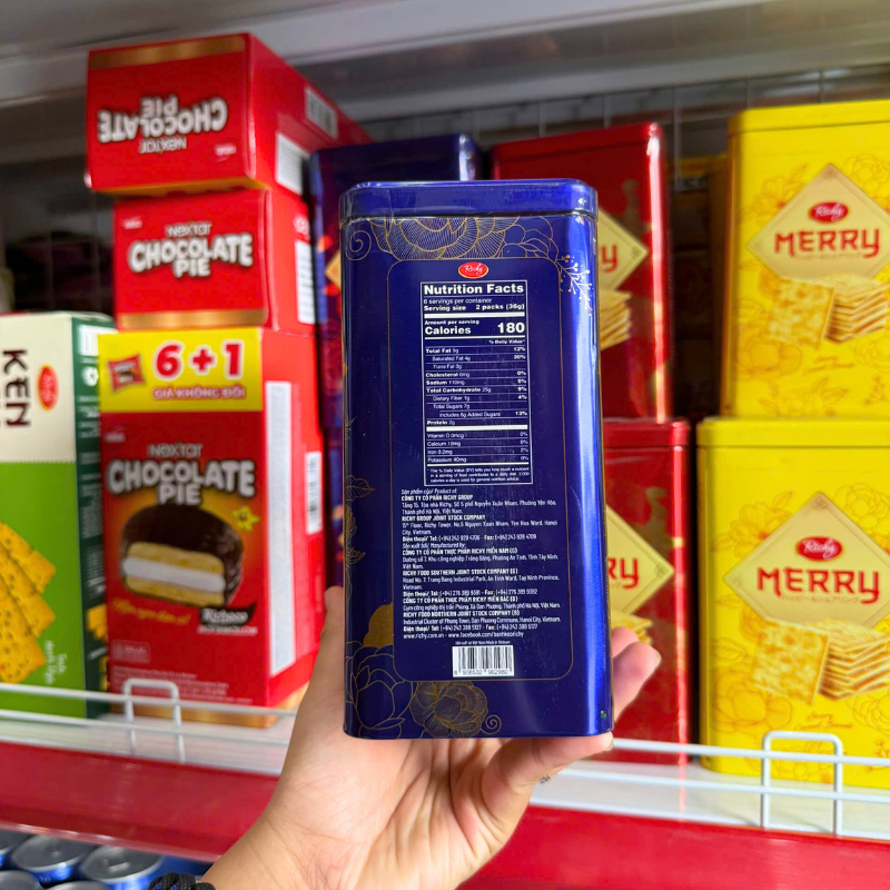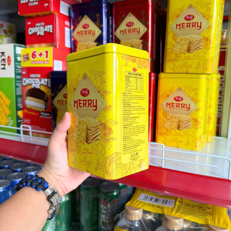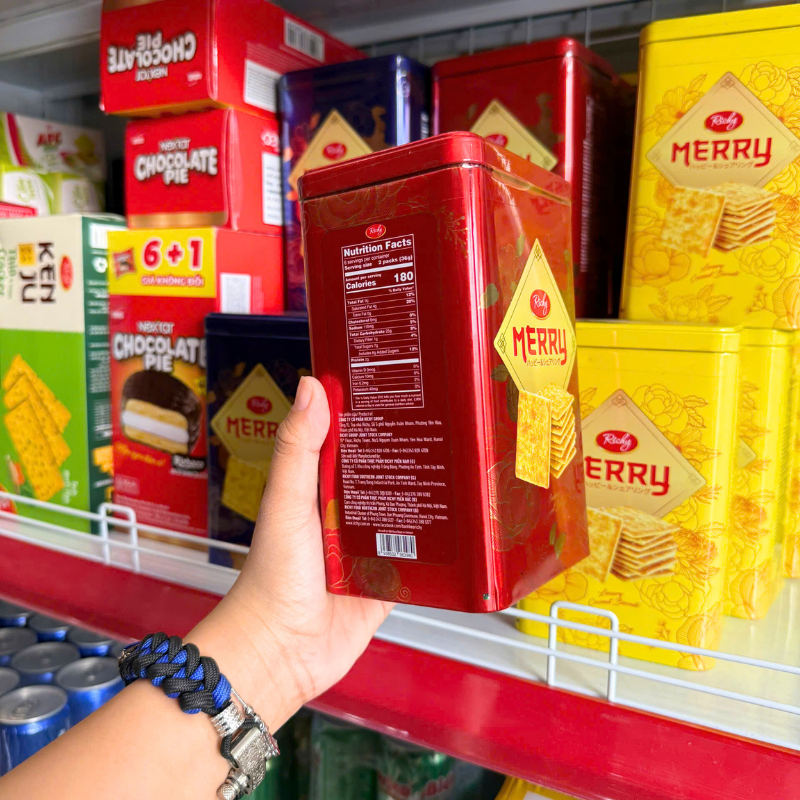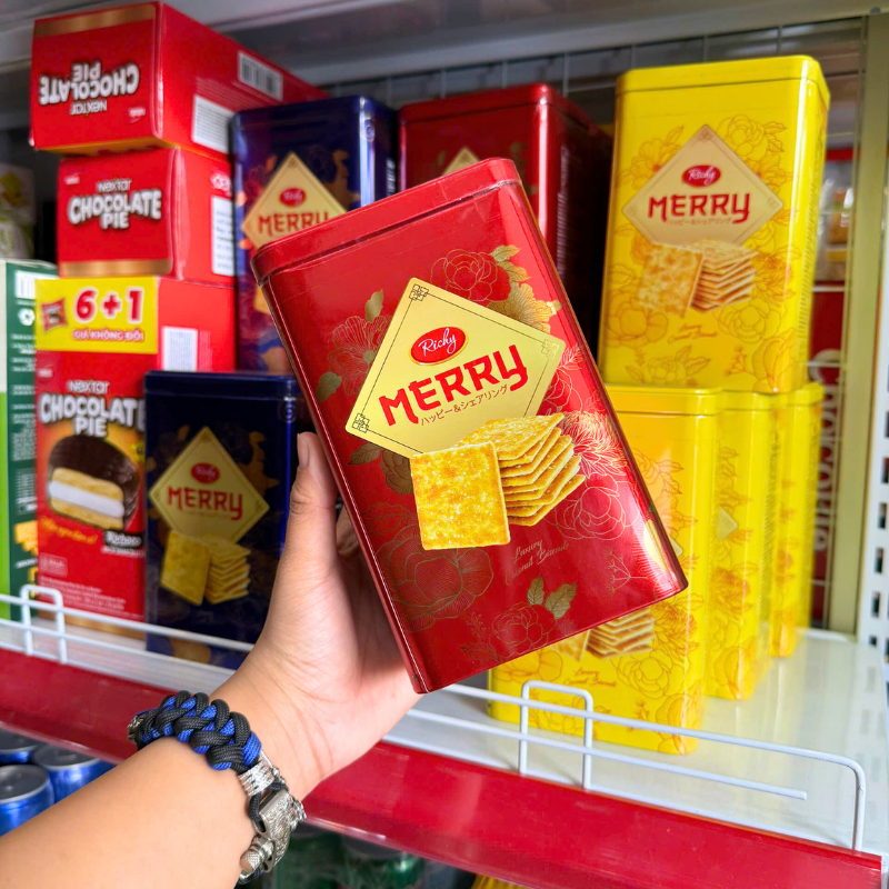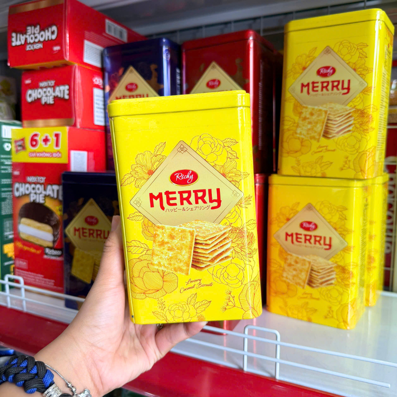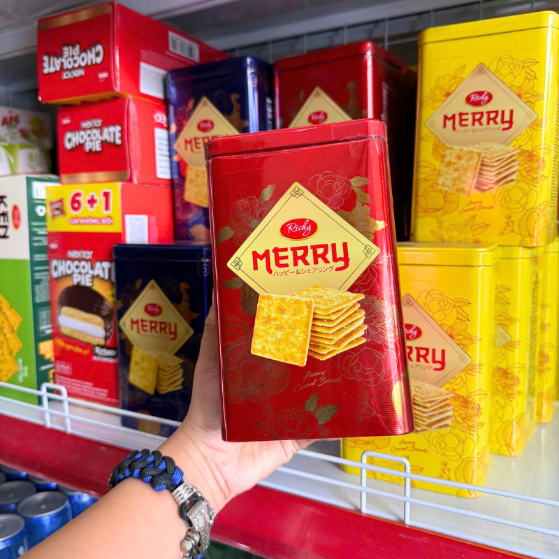 Bánh Quy Đường RICHY MERRY Thiếc Hình Trụ 156g (3 Màu Xanh Dương/ Vàng/ Đỏ)