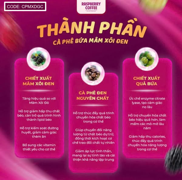 THÀNH PHẦN: Đường, Bột kem không sữa (Glucose Syrup, Protein từ sữa – Caseinates), Cà phê hòa tan (14%), Maltodextrin, Chiết xuất mâm xôi ( 2%), Chiết xuất quả bứa, Muối I-ốt, Hương cà phê tổng hợp và Hương mâm Xôi tổng hợp.