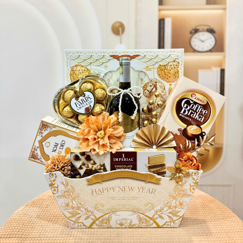 🎁 Bên trong gồm đủ bánh – socola – vang – trái cây sấy, toàn sản phẩm dễ dùng, giá trị thiết thực, lên form giỏ nhìn sang mà không bị rối.