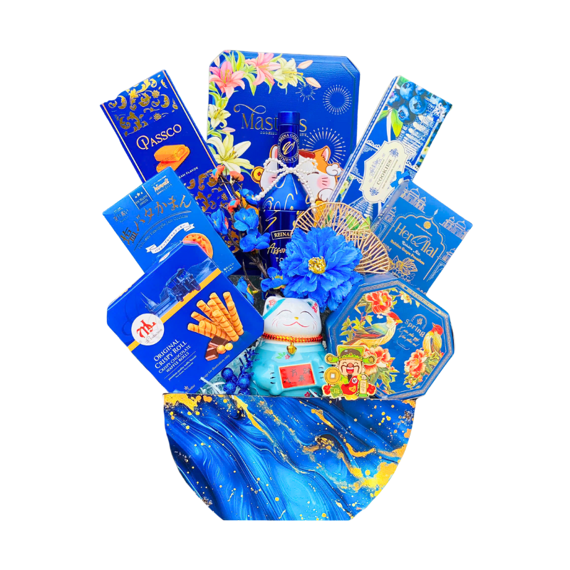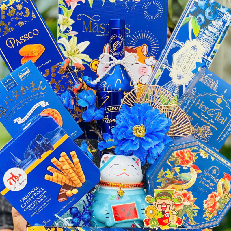Giỏ Quà Tết Mèo Thần Tài Xanh Dương Sang Trọng - Quà Tặng Tết - Quà Trang Trí Tết