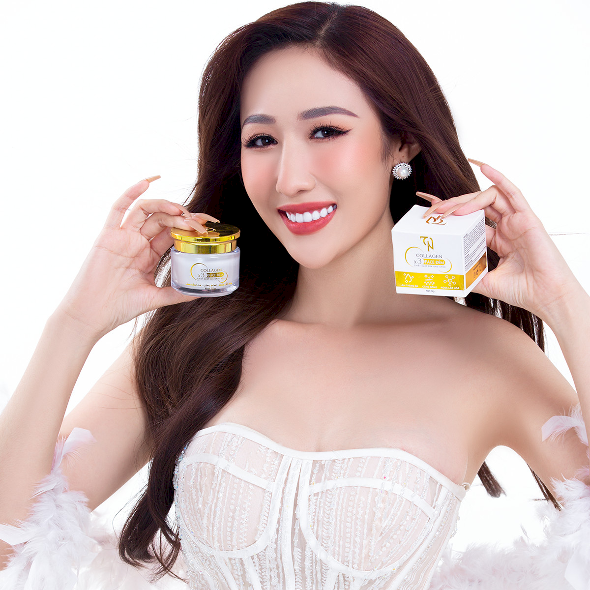 Aqua, Paraffinum Liquidum, Titanium Dioxide 5%, Panthenol, Niacinamide, Hyaluronic Acid, Peg-40, Olea Europaea Fruit Oil (Dáu oliu), Tocopherol (Vitamin E), Collagen, Carbomer, Fragrance, Camellia Sinensis Leaf Extract (Chiết xuất Trà xanh), 3-o-ethyl Ascorbic Acid (Vitamin C), Alpha-arbutin, Pearl Powder (Ngọc trai), Bisabolol, Centella Asiatica Extract (Chiết xuất rau má), Dipotassium Glycyrrhizate (Chiết xuất cam thảo), Hydrolyzed Royal Jelly Protein (Chiết xuất sữa ong chúa), Ganoderma Lucidum Extract (Chiết xuất Linh chi), Crocus Sativus Flower Extract (Chiết xuất hoa nghệ tây), Phenoxyethanol 0.7%, Triethanolamine 0.4%.