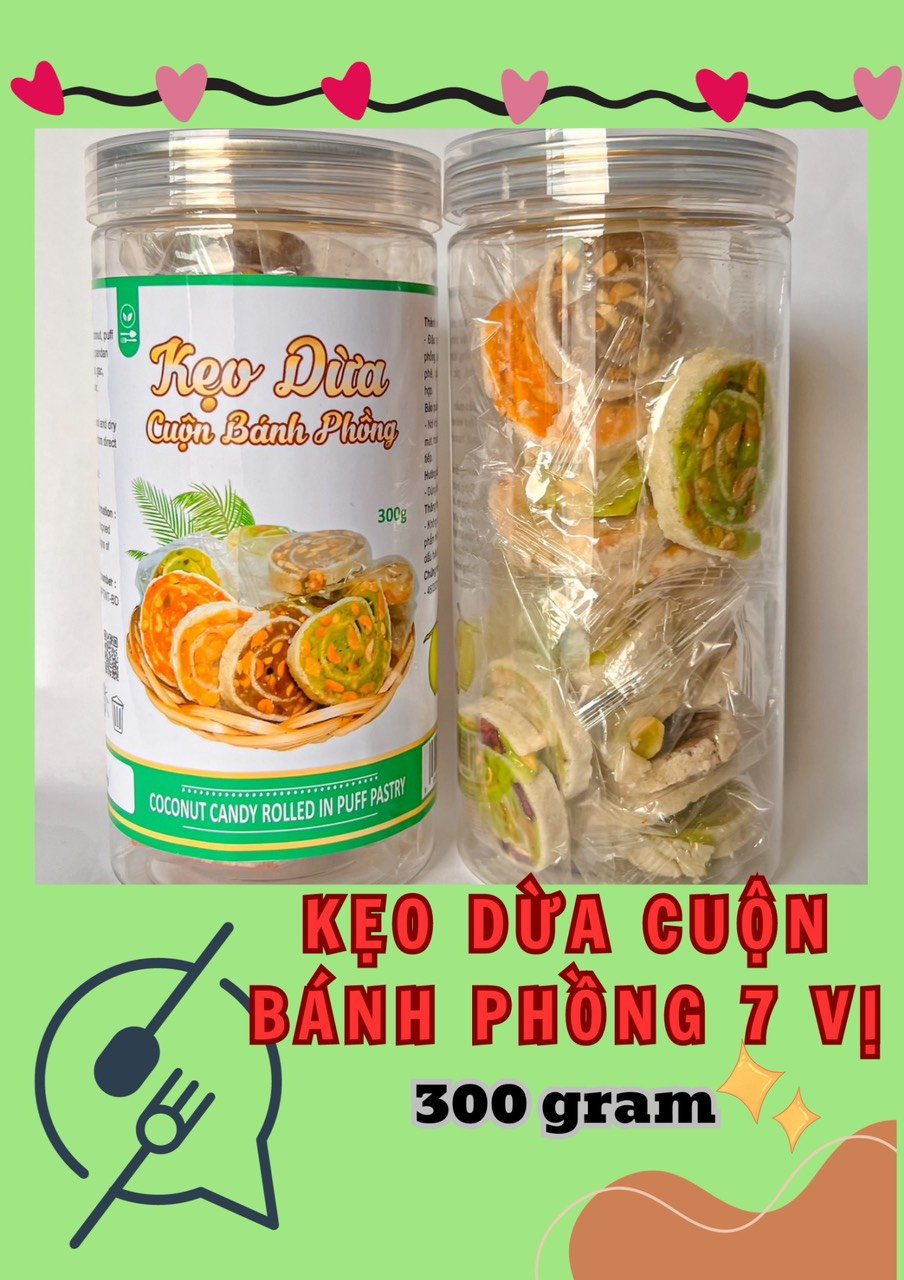 Kẹo Dừa Cuộn Bánh Phồng Mix 7 Vị Thơm Ngon 300g Hộp