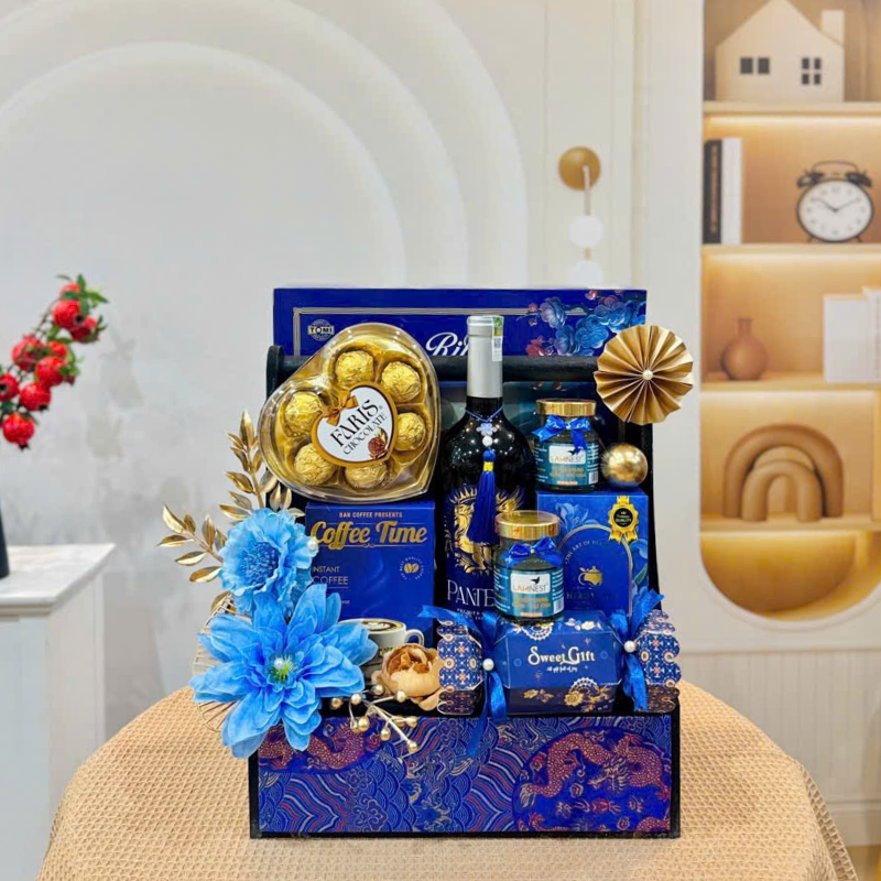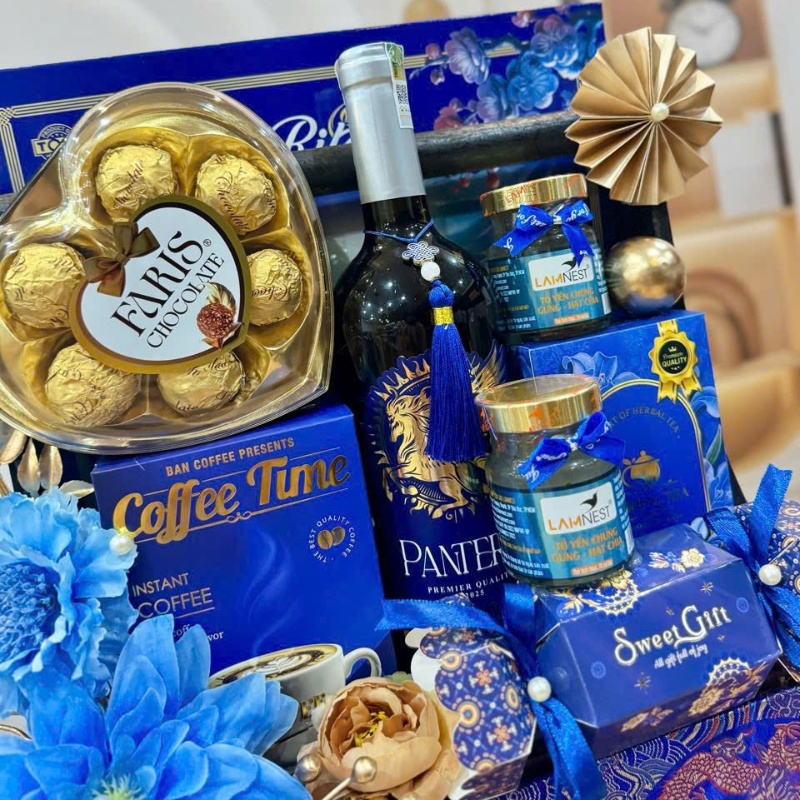 Mẫu giỏ Pantera 9 món với phối màu Xanh – Đỏ – Vàng mang ý nghĩa may mắn – thịnh vượng – an khang, cực hợp để biếu sếp, đối tác, khách hàng hoặc gia đình hai bên dịp Tết này.