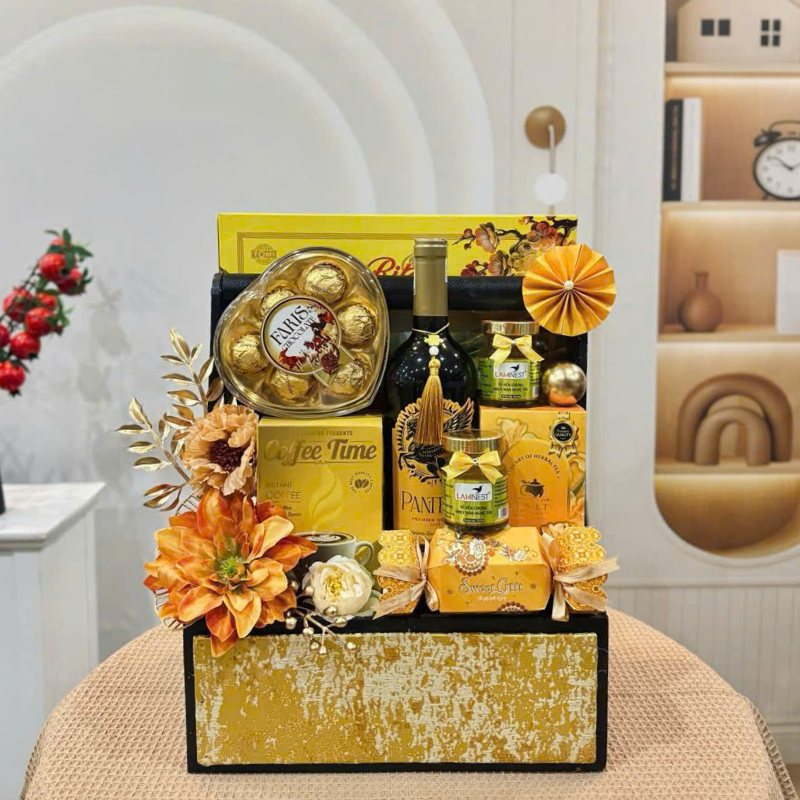 Giỏ lên chuẩn form, nổi bật – sang trọng – đủ vị, nhìn vào là thấy ngay sự đầu tư và thiện chí của người tặng 💛