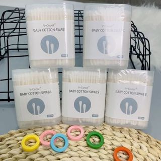 Sỉ hộp 200 Tăm Bông Ngoáy Tai – Tăm Bông Vcool 2 Đầu Tròn Và Dẹt Cho Bé Sơ Sinh 8x6x3.5cm